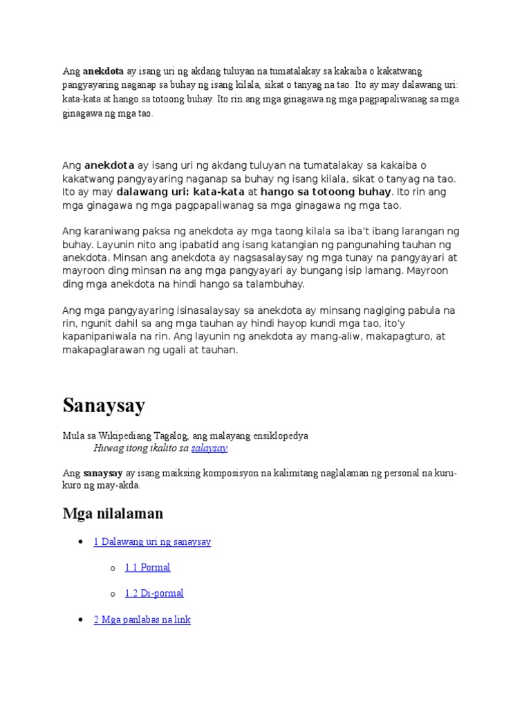 1 maiksing komposisyon 2 naglalaman ng personal na kuro-kuro nang may akda 3 may dalawang uri. Ng pagbuo sa Pilipinas ang Putting Usa at marami pang iba. Ang Panitikan Bago Dumating Ang.
